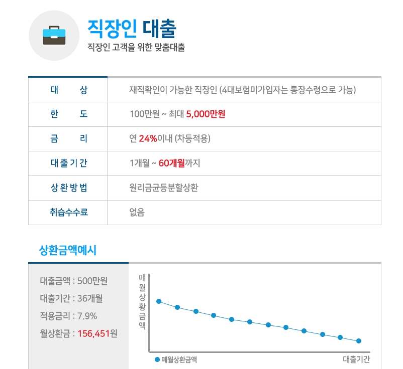 고금리의 채무를 저금리로 통합하시려는 분들을 위한 채무통합대출입니다. 연 24%이내의 금리로 최대 8000만원까지 진행이 가능하며 60개월까지 기간을 설정할 수 있습니다.